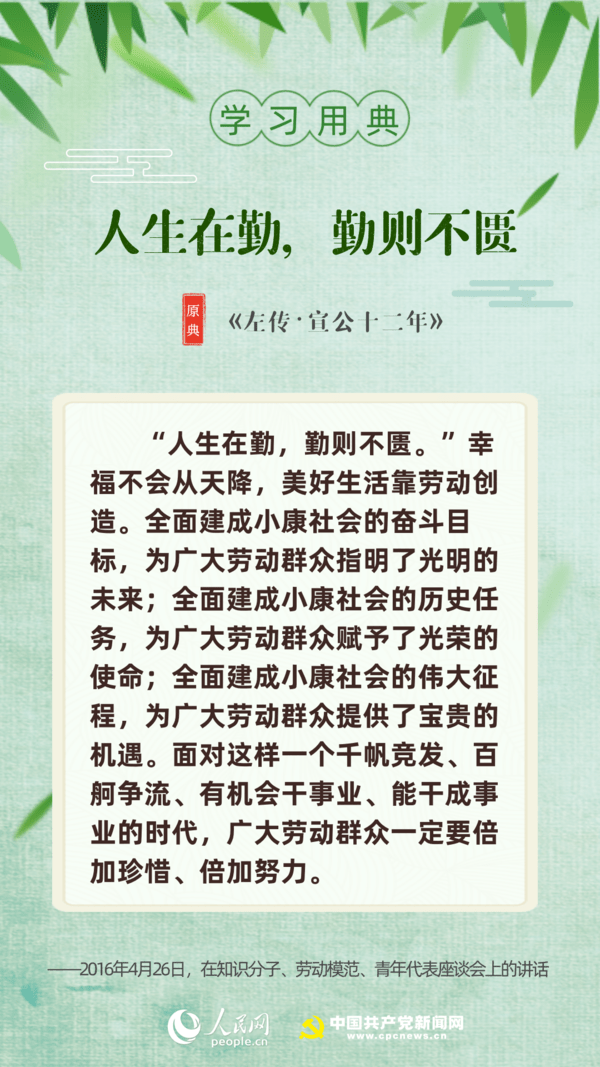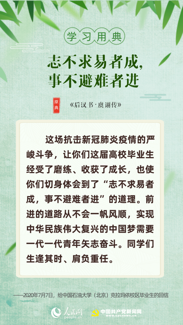 【编者按】“志不求易者成,事不避难者进。”近日,习近平总书记给中国石油大学(北京)克拉玛依校区毕业生回信,对广大高校毕业生提出殷切期望。“人生在勤,勤则不匮”“积土而为山,积水而为海”……近年来,习近平多次引用诗句典故,激励包含广大青年在内的全党全国各族人民拼搏奋进、埋头苦干。正值“战疫”“战贫”关键时刻,人民网·中国共产党新闻网与您一起回顾习近平讲话中关于“奋斗”的10个名句。