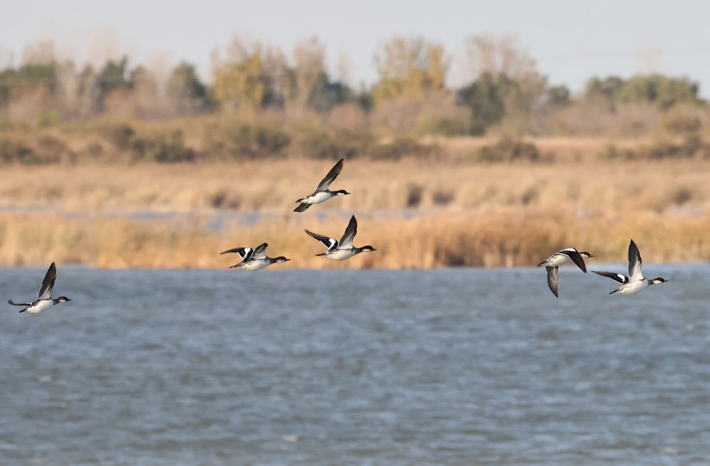 2023年11月12日,在黄河三角洲国家级自然保护区,越冬候鸟在飞翔。新华社记者 徐速绘 摄