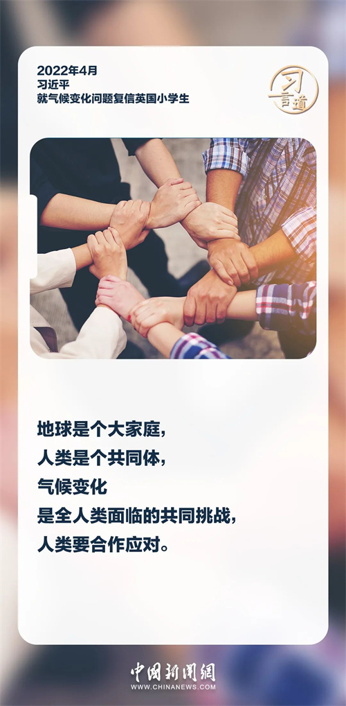 保护生态环境、应对气候变化是全人类面临的共同挑战。习近平主席高度重视应对气候变化国际合作,提出一系列重要倡议和主张,强调携手应对气候变化挑战,合力保护人类共同的地球家园。