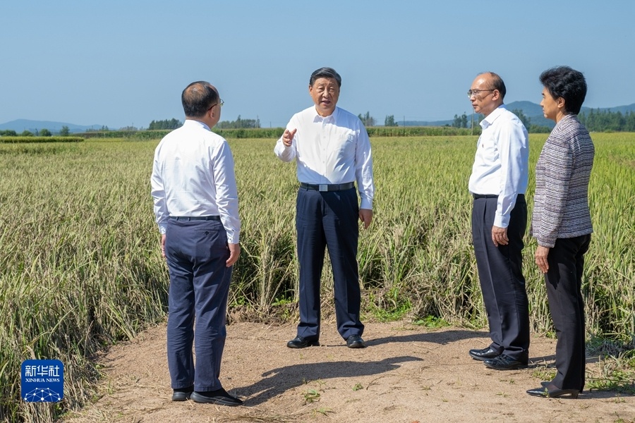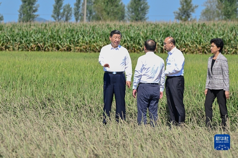9月6日至8日,中共中央总书记、国家主席、中央军委主席习近平在黑龙江考察。这是7日上午,习近平在遭受洪涝灾害的哈尔滨尚志市老街基乡龙王庙村,察看水稻受灾情况。新华社记者 谢环驰 摄