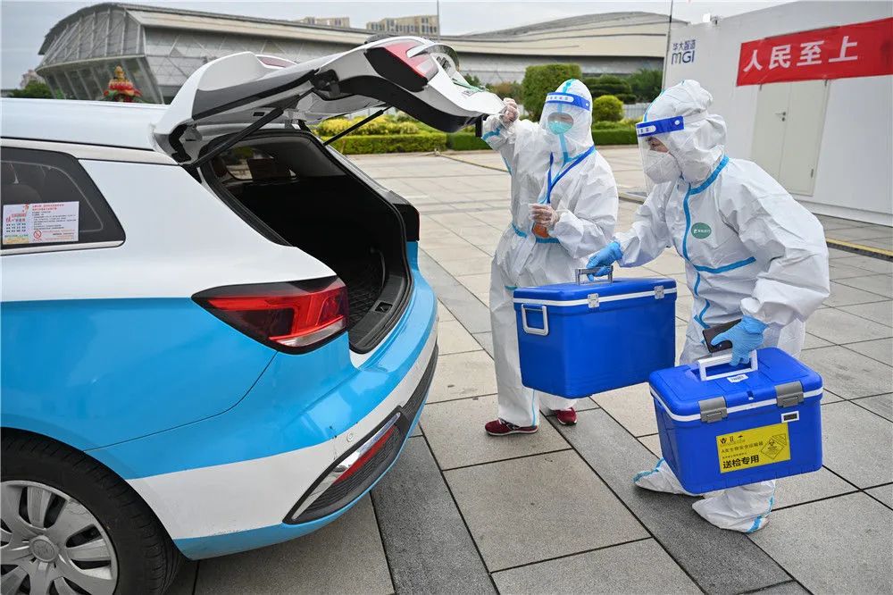 3月24日,在福建泉州市海峡体育中心联合方舱核酸检测基地,参加“抗疫志愿车队”的出租车司机(左)协助医务人员装运核酸检测样本。新华社发(周义摄)