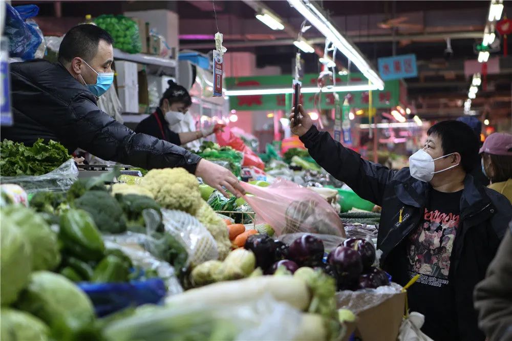 3月25日,在辽宁省沈阳市凤祥综合市场,一名市民买菜后扫码付款。新华社记者 王乙杰 摄