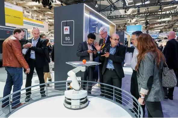 图为2018年4月24日,在德国汉诺威工业博览会上,参观者在华为公司展区观看运用第五代移动通信技术(5G)操控的机器人。新华社记者 单宇琦/摄