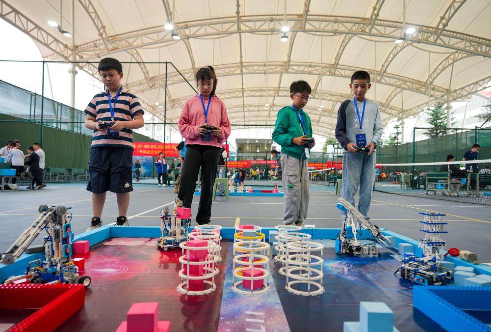 5月31日,四名参赛选手在全国青少年科技教育成果展示大赛云南省区域赛上操作机器人进行比赛。新华社记者 陈欣波 摄