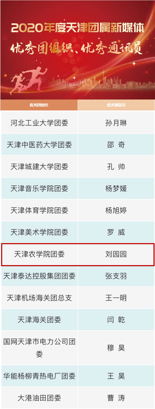 近日,由团市委宣传部主办,团市委综合服务中心、天津市青少年网络协会承办的面向我市基层团组织的“津彩青春 团聚V力”首届天津团属新媒体影响力推荐活动结果揭晓。校团委荣获2020年度天津团属新媒体“优秀团组织”称号,校团委刘园园荣获“优秀通讯员”称号。