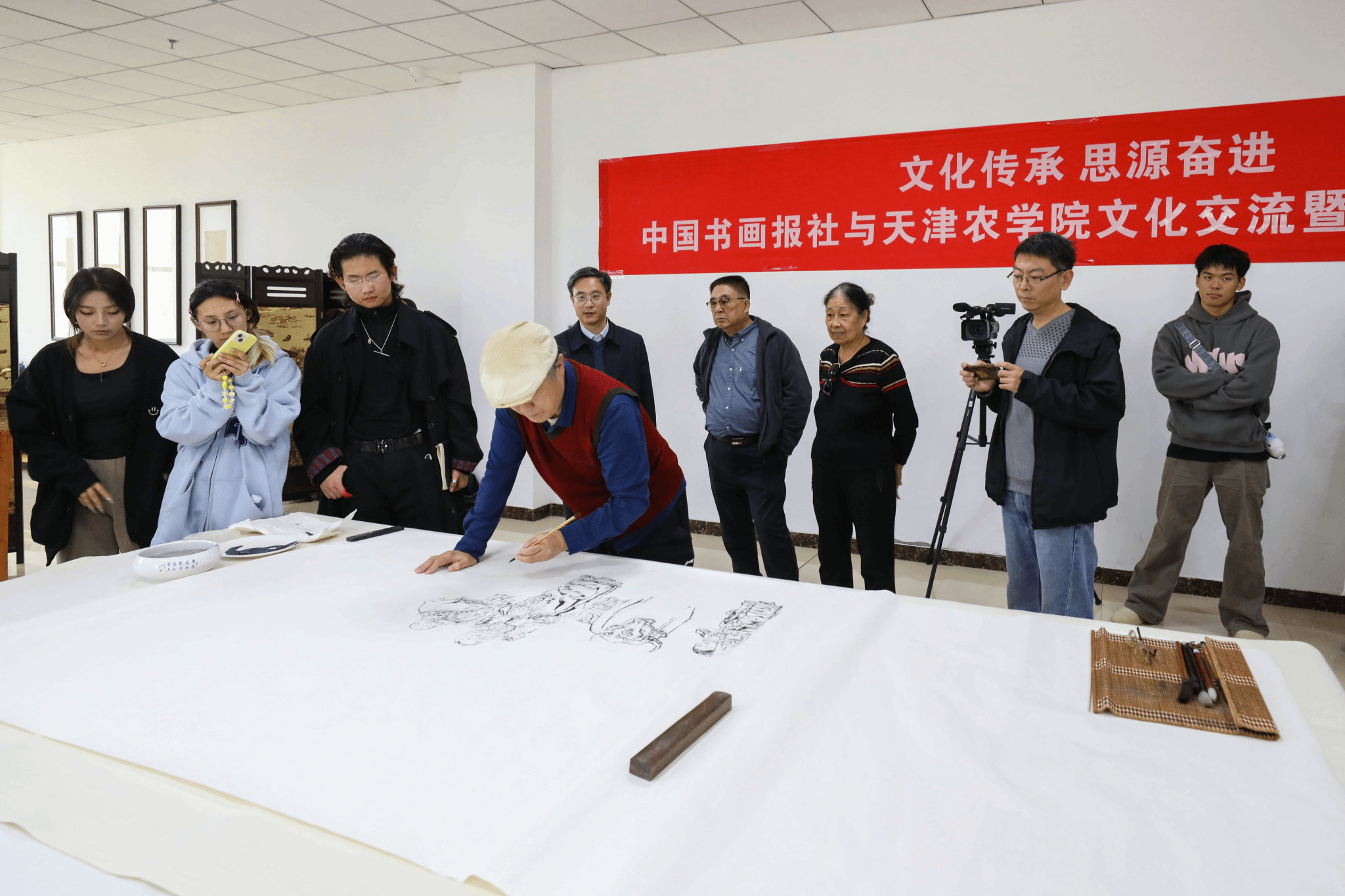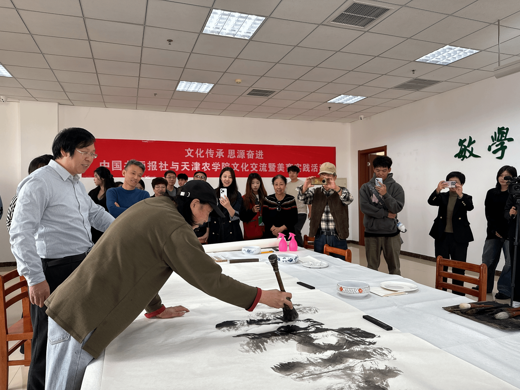 校党委书记李鑫致欢迎辞,他表示,非常感谢各位艺术家能够莅临学校进行笔会活动,此次活动是落实党的二十届三中全会精神、全国教育大会精神和贯彻落实习近平总书记视察天津时提出的“四个善作善成”重要要求,进一步推动文化传承发展,构建“三全”育人、“五育”并举大思政工作格局的重要举措,是开展大学生美育教育实践的重要内容,希望通过此次活动能够进一步丰富学校“思源·奋进”文化,进一步弘扬天农精神,打造自觉、自省、自律、自查、自纠的质量文化,提升天农师生的美育水平,达到以文化人的活动效果。