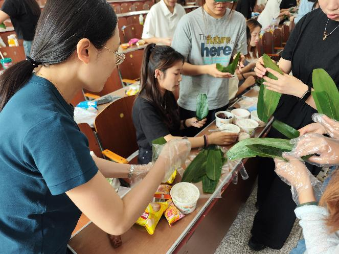 活动现场,同学们一起了解了端午包粽子的历史典故。随后,师生们一同认真学习粽子的制作方法,并亲手包粽子。新鲜的粽叶、糯米以及豆沙、蜜枣等馅料……卷粽叶、填糯米、放馅料、裹叶子、系棉线,许多同学都是第一次尝试包粽子,从生疏到逐渐熟练,大小不一的粽子展现了同学们参与的热情,浓浓的粽叶香,让师生共同感受到了端午节的温馨与甜蜜,传递了对学校、家人和同学的祝福。活动还设置了文艺表演和游戏互动环节,为活动增添了一份乐趣。