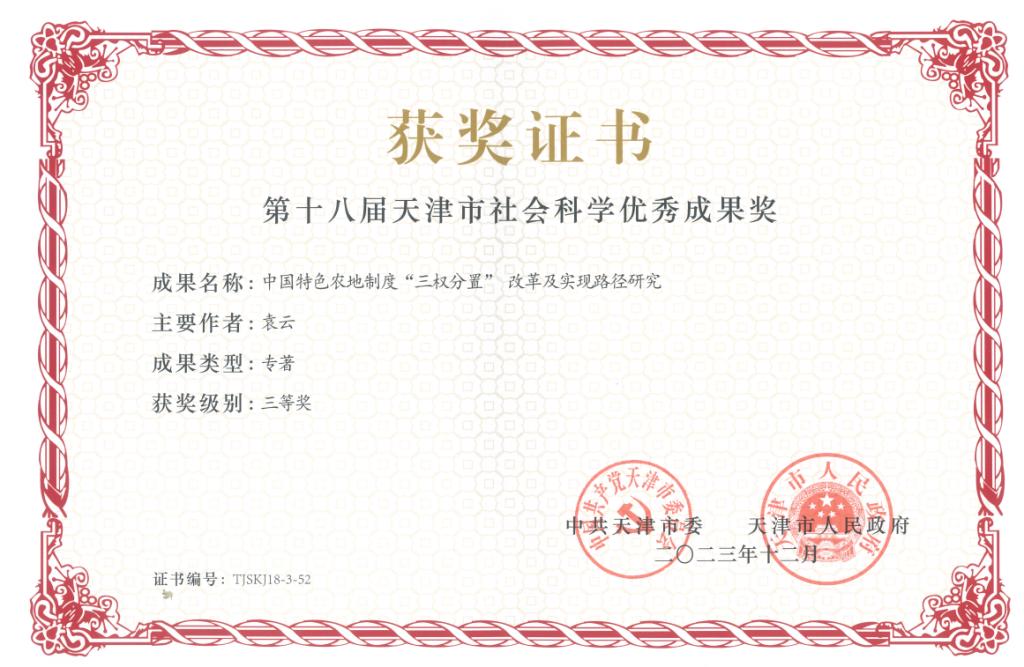 近日,第十八届天津市社科优秀成果奖评选结果公布,我校马克思主义学院袁云副教授独立编著的《中国特色农地制度“三权分置”改革及实现路径研究》喜获三等奖。