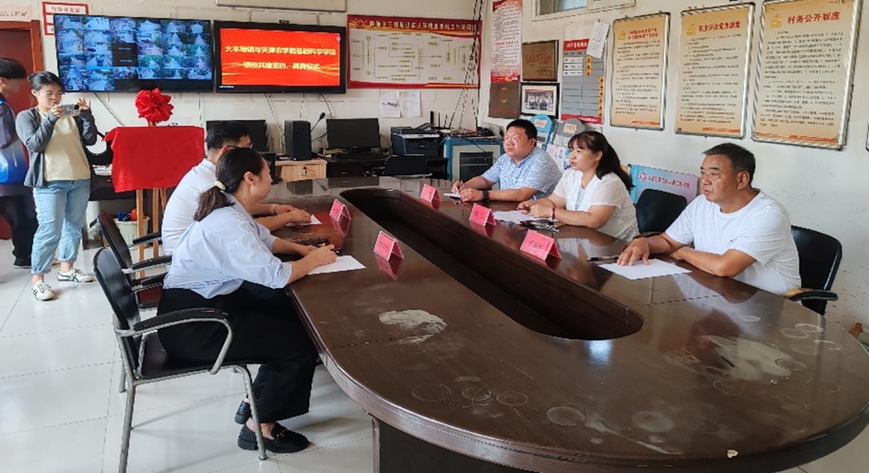 座谈会后,大丰堆镇党委副书记董悦与基础科学学院党委副书记、副院长杜召辉签订镇校共建协议,并进行新时代–实践行社会实践基地揭牌仪式。