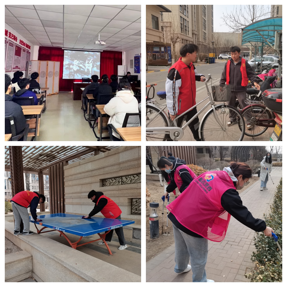 基础科学学院组织学生赴社会山东苑社区开展学雷锋志愿服务系列活动。活动伊始,社会山东苑社区团支部组织青年团员们观看影视作品《雷锋》。观影结束后,志愿者们分组参与了小区楼道杂物清理打扫和小区环境卫生清整等工作。他们将楼道转弯处堆积的废纸盒等杂物一一清理出楼道,将电动自行车棚的自行车摆放整齐,将草坪中的烟头清理干净......清理完毕后,小区的面貌焕然一新。