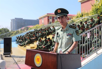 承训部队教官代表杨鹏超发言,他希冀同学们要把在军训中养成的好思想、好作风、好习惯带到学习生活中去,做到军训一日,受益终身。