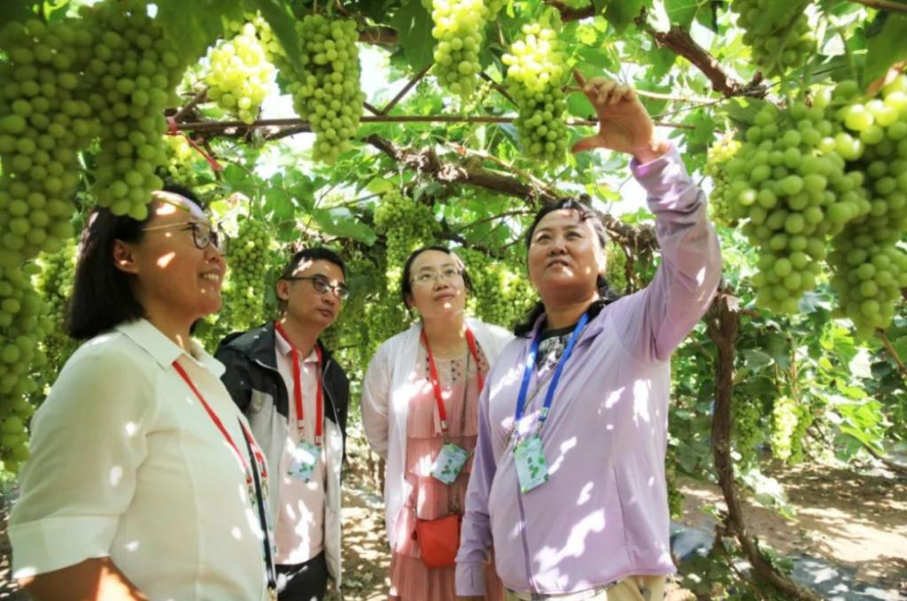 7月14日,在三堡乡葡萄示范园,中国农学会葡萄分会常务副会长、国家葡萄产业体系岗位专家、威客电竞田淑芬研究员正在向团队教师介绍无核白葡萄的管理种植情况。