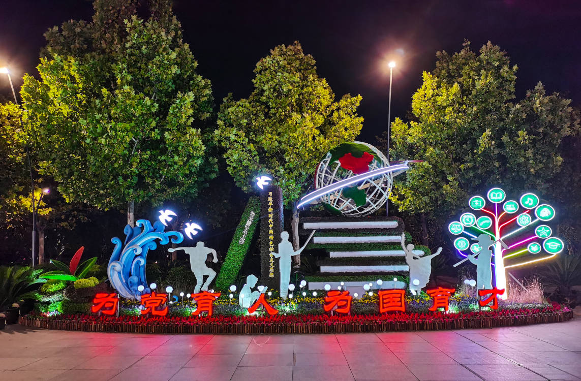 该主题景观从生动的教育实践中汲取设计灵感,着力体现“教育之魂” “教育之本” “教育之为”“教育之境”。展区主体景观以形似字母“LD”的书本和有神州飞船绕行的地球为背景,“LD”意为“立德”,体现天津教育坚持立德树人根本任务,面向现代化、面向世界、面向未来,办人民更加满意的教育。展区景观还包括了海河浪花、和平鸽、月季花、师生像、智慧树等元素,既体现了海河水的滋养和哺育,又形象展现了学生德智体美劳全面发展、成长成才的奋进之路,饱含着我市每一名教育工作者的初心使命和育人情怀。