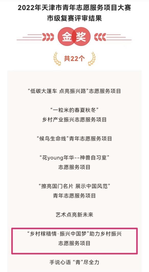 9月9日,天津市青年志愿服务项目大赛落下帷幕,我校“乡村稼穑情·振兴中国梦”助力乡村振兴志愿服务项目荣获2022年天津市青年志愿服务项目大赛金奖,这是我校参赛历史上的最好成绩。
