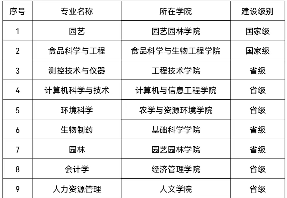自教育部2019年启动为期三年的一流本科专业建设“双万计划”以来,我校在地方赛道评审中,共获批国家级一流本科专业建设点6个,分别是:食品质量与安全、农学、水产养殖学、动物医学、食品科学与工程、园艺;获批省级一流本科专业建设点17个,分别是:农业机械化及其自动化、水文与水资源工程、物联网工程、旅游管理、水利水电工程、植物保护、种子科学与工程、动物科学、海洋渔业科学与技术、农林经济管理、测控技术与仪器、计算机科学与技术、环境科学、生物制药、园林、会计学、人力资源管理。至此,省级及以上一流本科专业建设点数量达到招生专业总数的48.94%,实现二级学院全覆盖。