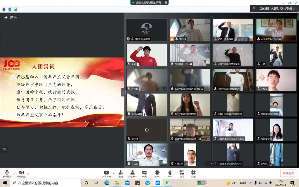 随后,校团委刘园园老师宣读新团员名单。新团员佩戴团徽,新老团员代表庄严宣誓。人文学院孙晴同学作为新团员代表发言,从思想进步、素质提升、投身实践等方面分享了一名新团员的收获和感悟。