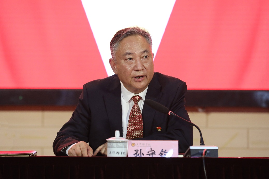 孙守钧指出,在庆祝我们党百年华诞的伟大时刻,我们扎实开展党史学习教育,正当其时。要深入学习领会习近平总书记关于党的历史的重要论述,充分认识开展党史学习教育的重大意义。要认真研读党史基本著作,全面了解中国共产党百年奋斗的光辉历程和历史性贡献。要充分发挥党的历史以史鉴今、资政育人的作用。在庆祝我们党百年华诞的伟大时刻,我们坚持和加强党的领导,进一步夯实党建基层基础,正当其时。要加强党的政治建设,自觉用实际行动践行“两个维护”。要加强党的思想建设,及时跟进学习党的最新理论。要加强党的组织建设,特别是要高度重视基层党建工作,充分发挥党支部的战斗堡垒作用。要加强党的纪律建设和作风建设,以铁的纪律、严的作风树立起新时代党员干部良好形象。在庆祝我们党百年华诞的伟大时刻,我们坚持“树正气、聚人气、鼓士气”,打造干事创业的党员干部队伍,正当其时。办好天农的事情,关键在党;落实党的决策部署,关键在人。党员干部要干事创业、争先有为。要有敢于担当、敢为人先的精神,要具备闯险滩、越关山的能力。党员干部要廉洁自律,不仅要廉洁,更要自律,清正廉洁和严于律己是党员干部的基本要求。在庆祝我们党百年华诞的伟大时刻,我们坚持以立德树人为根本、以强农兴农为己任,接续在希望的田野上建功立业,正当其时。要坚持立德树人的根本任务,发挥好我校“一二三四五”思政工作体系作用,紧紧围绕“爱党、爱国、爱农、爱校”主题,全面加强思想政治教育,全面深化党史学习教育、推进“四史”教育,不断提升我校思想政治工作效果。要牢记强农兴农的使命担当,创新人才培养模式,突出“新农科”建设,坚持“五育”并举,培养德智体美劳全面发展,富有“三农”情怀的高素质应用型人才。千秋伟业,百年正是风华正茂;征途漫漫,唯有奋斗方可前行致远。新时代、新征程,让我们从百年党史中汲取奋进的力量,坚持以立德树人为根本、以强农兴农为己任,为助力乡村振兴、建设高水平农业大学砥砺奋斗,为实现中华民族伟大复兴砥砺奋斗!