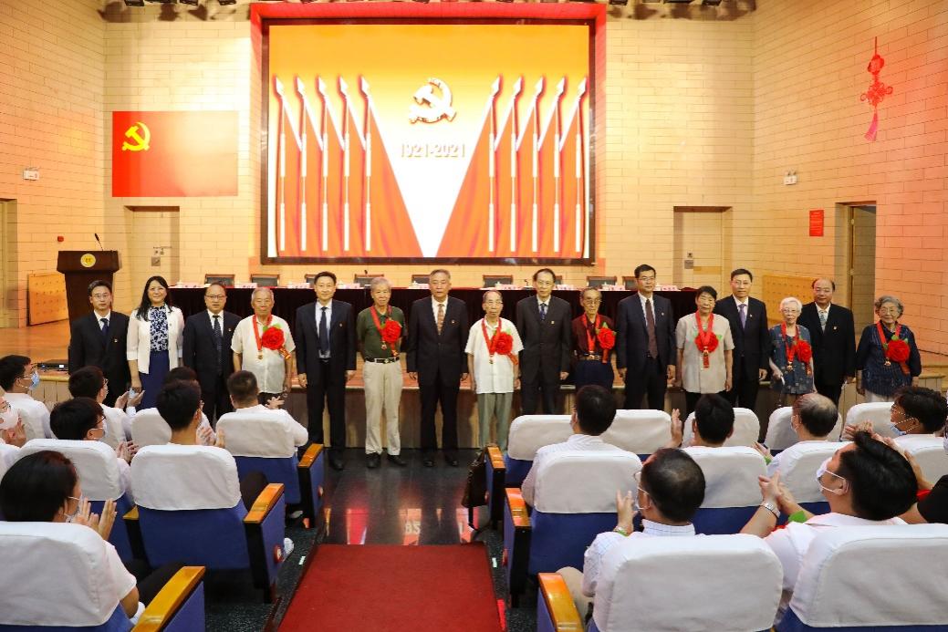 校领导向老党员同志代表颁发“光荣在党50年”纪念章。