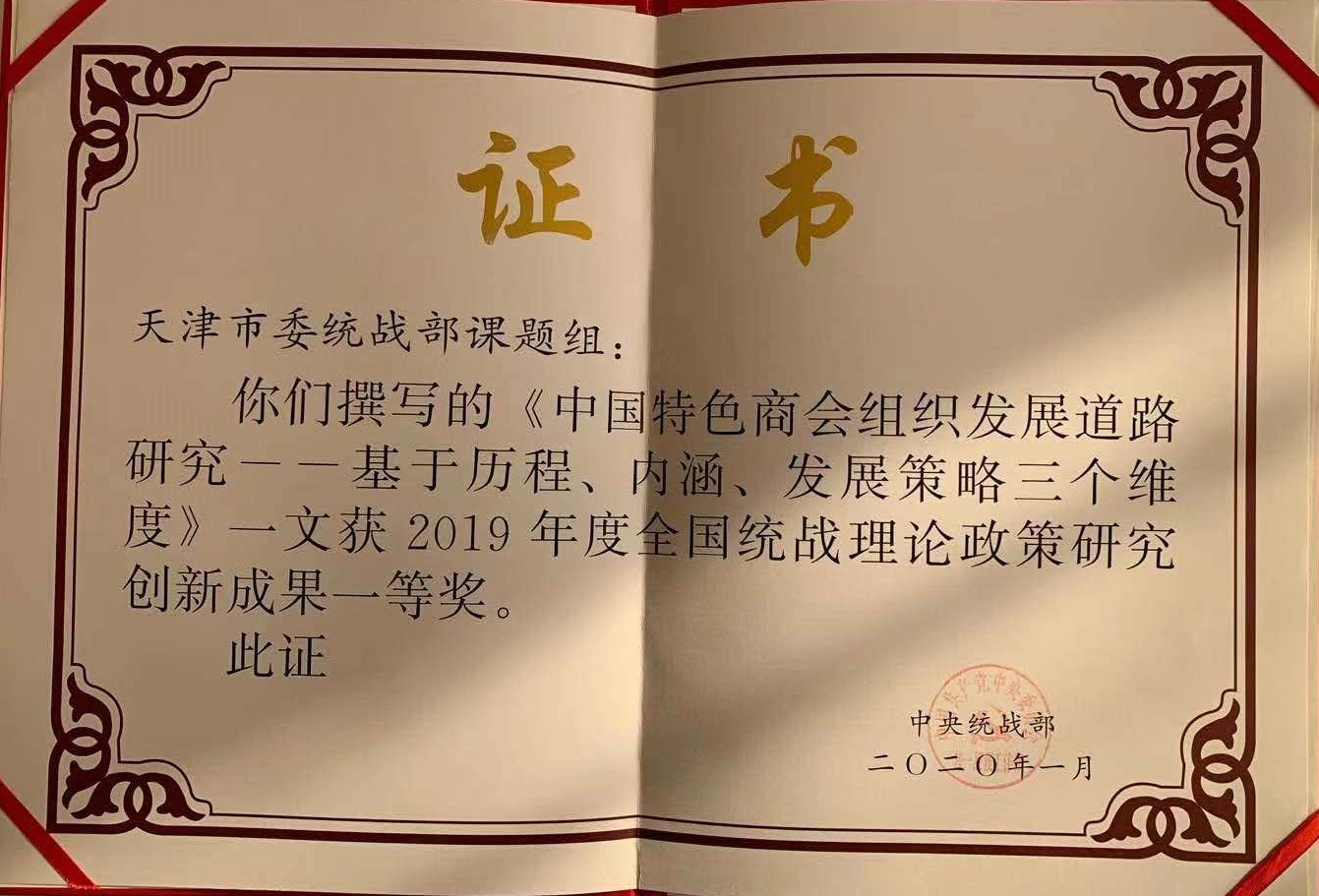 今年1月,中央统战部通报表彰了2019年度全国统战理论政策研究创新成果评选结果,我校与天津市委统战部合作撰写的论文《中国特色商会组织发展道路研究——基于历程、内涵、发展策略三个维度》荣获2019年度全国统战理论政策研究创新成果一等奖。