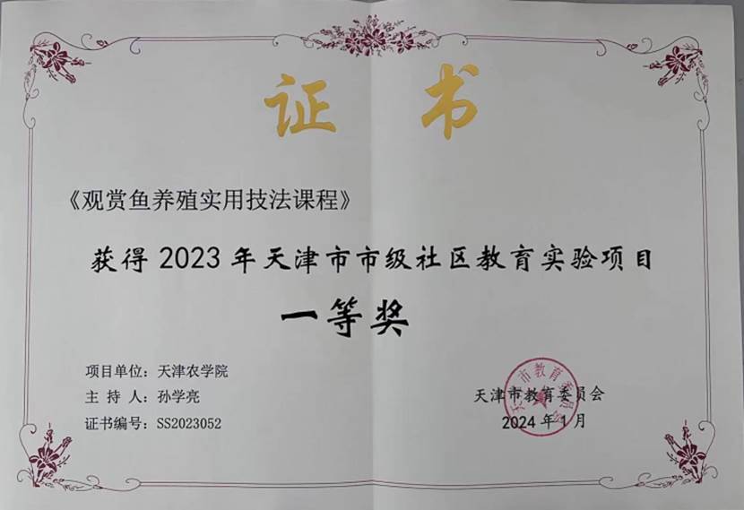 近日,水产学院孙学亮高级实验师主持的教育部“能者为师”项目《观赏鱼养殖实用技法课程》,荣获2023年天津市市级社区教育实验项目一等奖。
