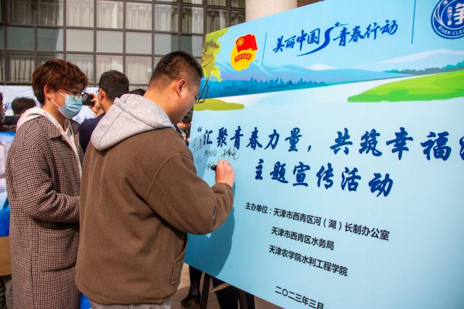 3月24日,水利工程学院联合西青区河(湖)长制办公室、西青区水务局开展了“汇聚青春力量,共筑幸福河湖”主题宣传活动。西青区河(湖)长制办公室、西青区水务局工作人员走进校园,与学院学生志愿者一起围绕2023年“世界水日”“中国水周”主题在校内开展现场宣讲,发放《强化依法治水,携手共护母亲河》《全面落实河湖长制》《节约用水》以及水法相关宣传册,向校内学生现场讲解保护水环境、修复水生态重要性和全面推行河湖长制的重要意义,全方位地向学生传递了爱河护河的迫切性,让学生们对保护河湖有了更具象的认识。活动中,学生们纷纷在“汇聚青春力量,共筑幸福河湖”活动展板上签字留念,写下自己对保护母亲河的美好心愿,表达了自己“珍惜水、爱护水、节约水”的意愿。