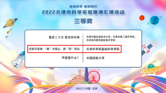 近日,在天津市科学技术局、天津市教育委员会主办的2022年第五届天津市科学实验展演汇演活动中,由基础科学学院教师刘大颖指导,王冉冉、丁琳、马文哲、杜贞营、李玟慧等同学展演的科学实验作品《垃圾巧变身——“碳”为观止,脱“荧”而出》从众多参赛作品中脱颖而出,荣获三等奖。本次展演活动评出一等奖1项,二等奖2项,三等奖3项。此6件作品将代表天津市将参加全国科学实验展演汇演活动。