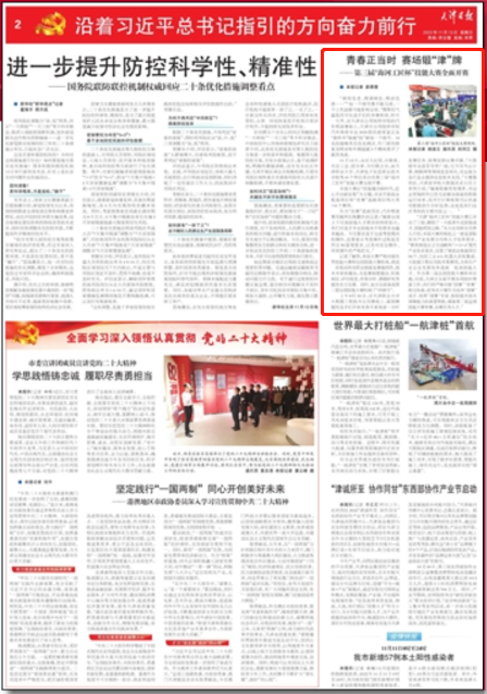 (左图:大数据工程技术应用赛项裁判组合影。右图:《天津日报》报道首日竞赛作为大数据工程技术应用赛项裁判长—我校计算机学院王育欣教授接受采访内容)