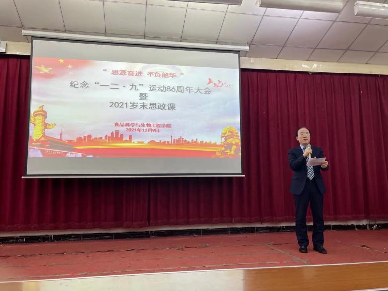 12月9日,食品科学与生物工程学院在西校区举办 “思源奋进 不负韶华”纪念“一二·九”运动86周年大会暨2021岁末思政课。食品科学与生物工程学院党政领导、各系主任和2021级学生辅导员、班主任参加。