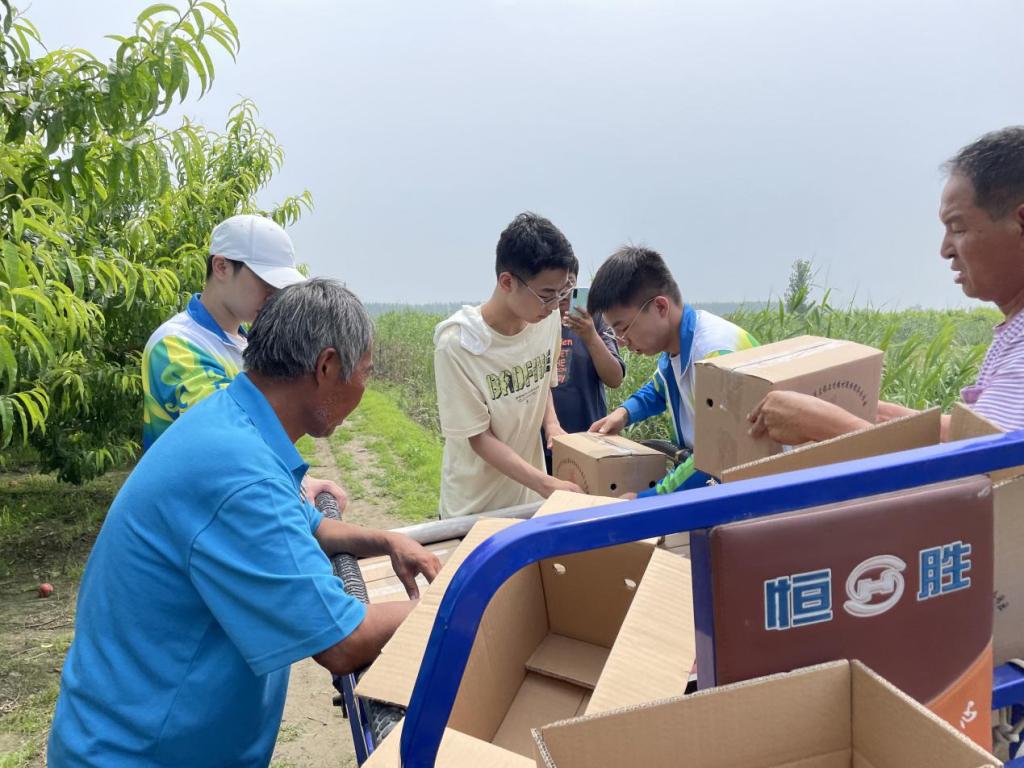 活动开展前,实践团同学在指导教师的带领下,还征集了600斤春雪桃订单,向2户有销售困难的老年果农定向采购,缓解销售压力。在果园,实践团冒着30多度的高温,采摘、封箱、搬运,汗水湿透衣衫。
