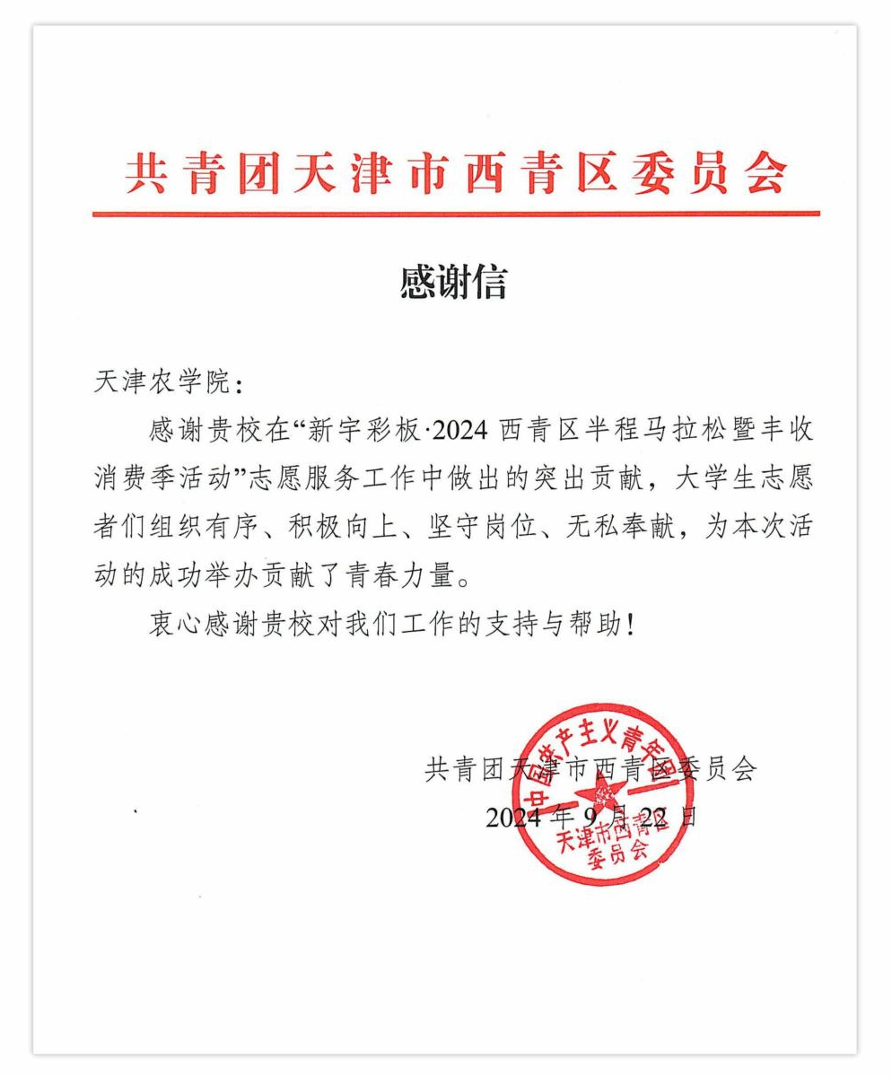 日前,我校收到西青团区委发来的感谢信,对我校全体志愿者在西青区半程马拉松志愿服务活动中的杰出表现以及学校给予的大力支持与帮助表示诚挚感谢。
