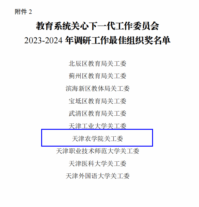 近日,天津市教育系统关工委下发《关于公布 2023-2024 年调研课题结项情况和优秀调研成果的通知》,经专家评审,我校组织申报的9项调研课题均予以结项,其中刘妍(园艺园林学院)、李欧静两位老师分获调研成果二等奖,我校关工委获优秀组织奖。