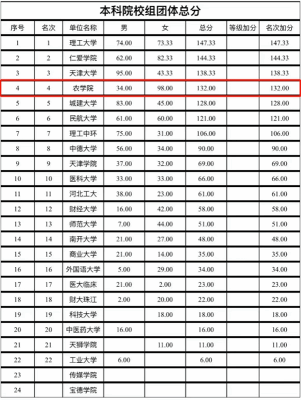 在刚刚结束的2025年天津市第十六届大学生田径冠军赛上,王恒、李宇歌、孙定发、孔龙四位老师带领我校田径队经过三天的激烈角逐,以132分的总成绩名列团体总分第四名,并获得女子团体总分第一名。其中金牌2枚,银牌7枚,铜牌2枚,共获得前八名奖项35项,继2023年以来再次创下了我校在天津市大学生田径运动会比赛中历史最好成绩。