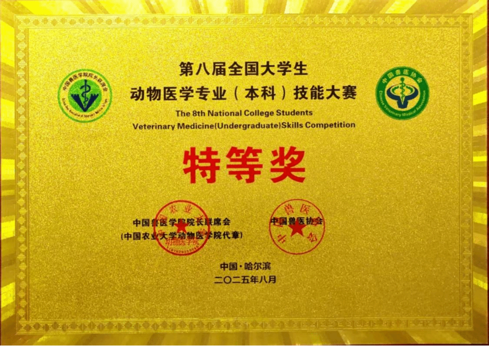 8月18日至21日,第八届全国大学生动物医学专业(本科)技能大赛在东北农业大学举行。我校代表队荣获大赛团体特等奖,也是我校连续四届获得团体一等奖后的新突破。