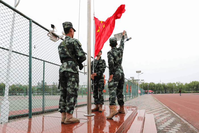 伴随着校歌激情欢快的旋律,英姿飒爽的三名旗手护卫着校旗走向主席台,全体同学行注目礼。