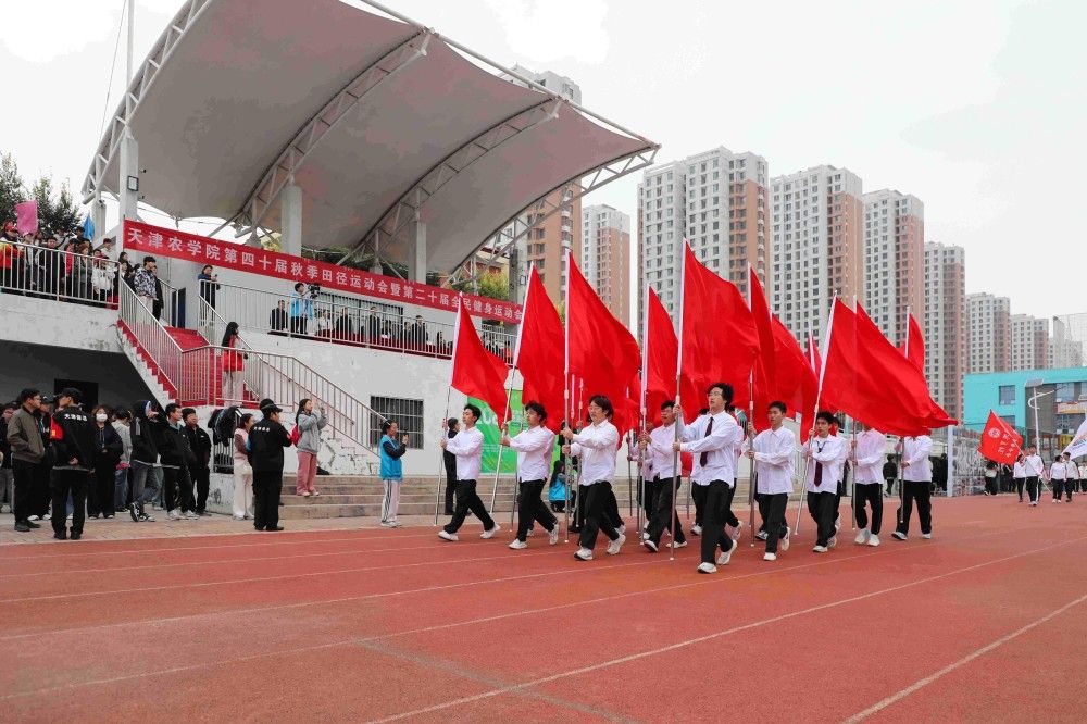 由全校各学院学生、裁判员代表和校田径运动队队员组成的方阵依次入场,他们精神昂扬、步伐铿锵,充满学科特色的风采展示,彰显了天农师生思源奋进的精神面貌。