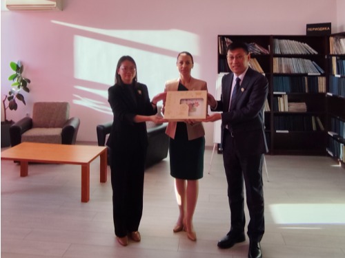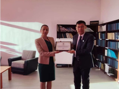 副校长张民向校长伊万诺娃赠送我校纪念牌匾