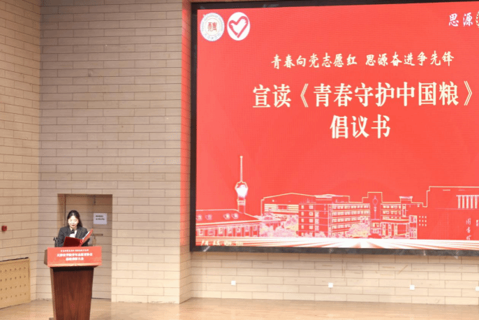 会上,校青年志愿者协会主席团成员王思颖宣读《青春守护中国粮》倡议书,号召广大青年以青春之力守护粮食安全,以强农兴农为己任,在珍惜粮食活动中走在前、做示范,为全社会营造节约粮食的良好风尚。