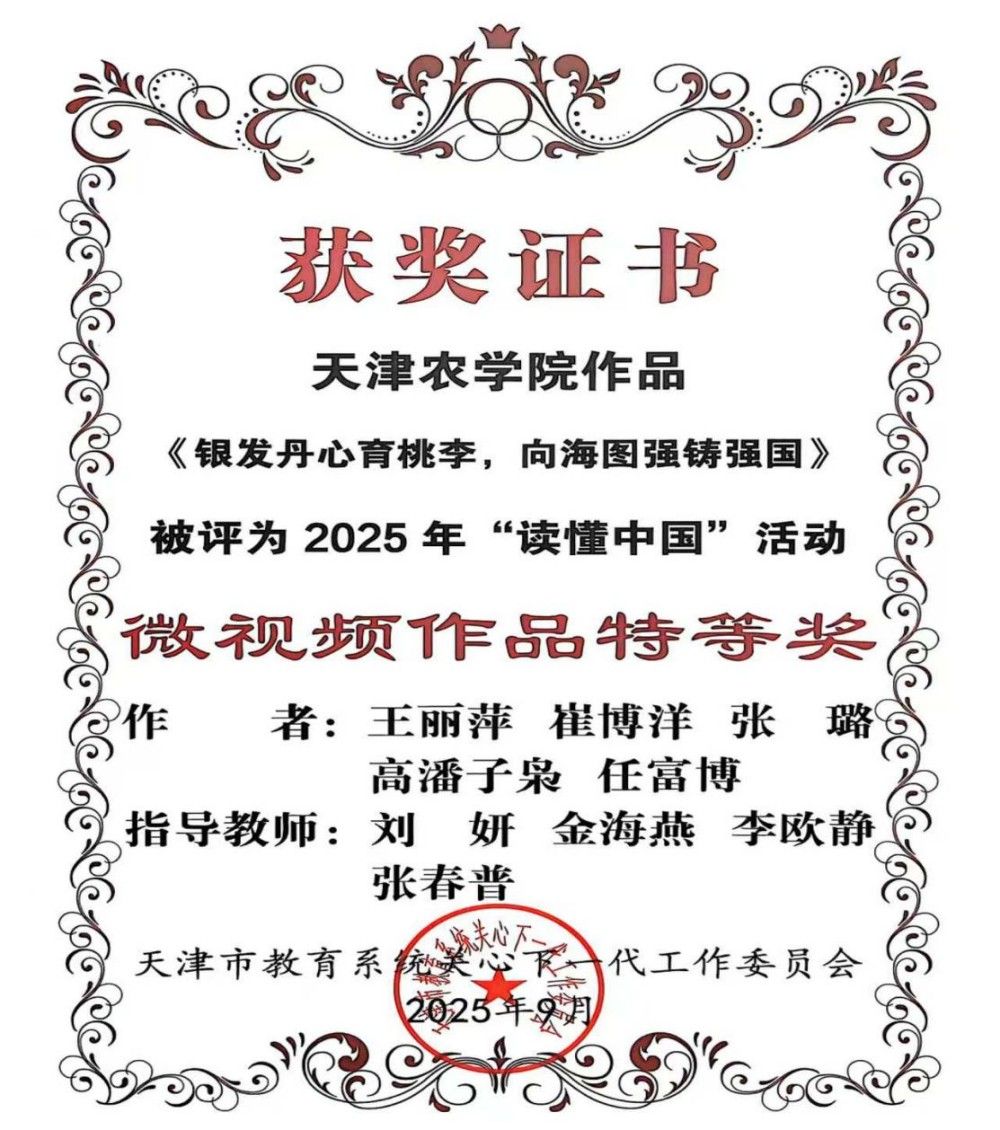 在2025年“读懂中国”活动中我校报送的微视频作品《银发丹心育桃李 向海图强铸强国》荣获天津市特等奖