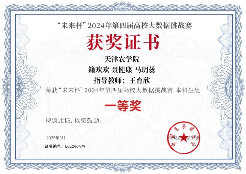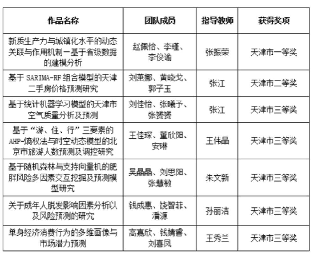 我校学生在2025年第十一届全国大学生统计建模大赛天津赛区比赛中获得天津市一等奖1项,天津市二等奖1项,天津市三等奖5项。