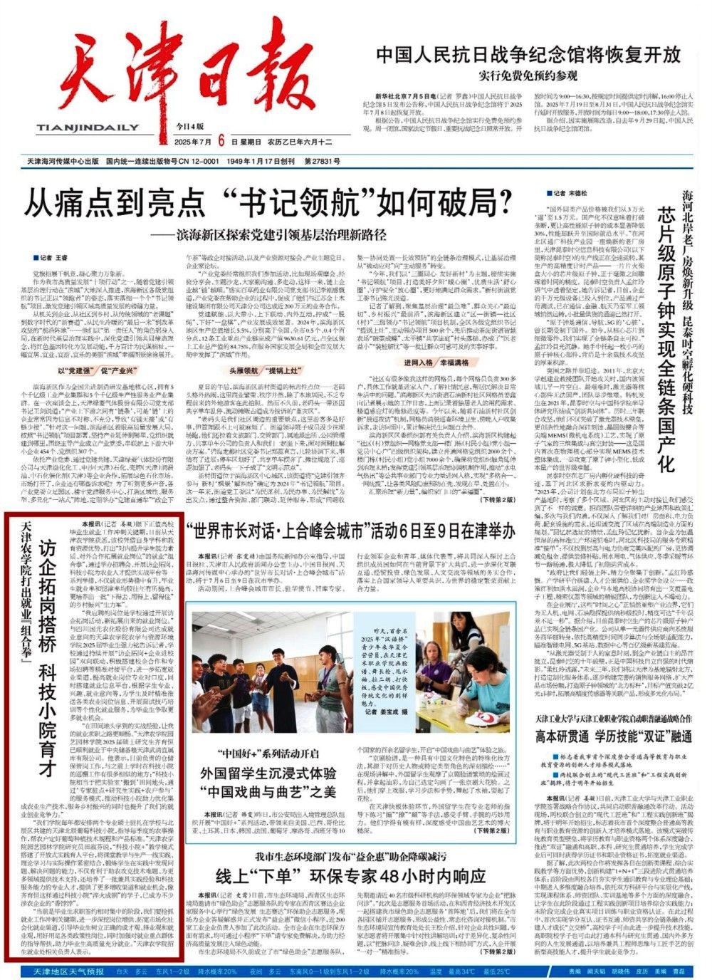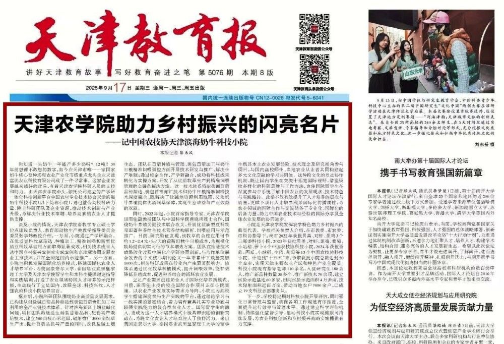 《天津日报》头版专题报道我校通过举办招聘会、开展访企拓岗、科技小院为农业人才提供实战平台等一系列举措,不仅就业形势稳中有升,毕业生就业率和留津率均较往年有所提高,更培养出一批“下得去、用得上、留得住”的乡村振兴“生力军”。