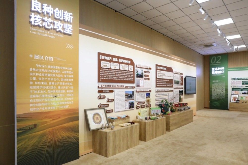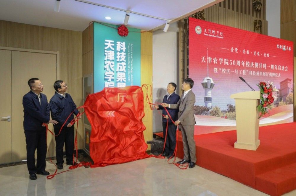 在我校50周年校庆倒计时一周年之际,学校举行了校庆倒计时一周年启动会暨科技成果展厅揭牌仪式。科技成果展厅是对我校建校50年来优秀科研成果的一次全面梳理和推介,是面向社会集中展示天农的重要窗口和平台。展厅内陈列的每一章文字、每一组数据、每一件实物、每一幅图片、每一段影像,都生动诠释了天农人“把论文写在大地上”的实践理念。展厅的启用不仅标志着学校在科研创新道路上迈出了坚实的一步,更象征着为服务建设农业强国国家战略、推动我市打造现代都市农业升级版目标又贡献了一份天农力量。