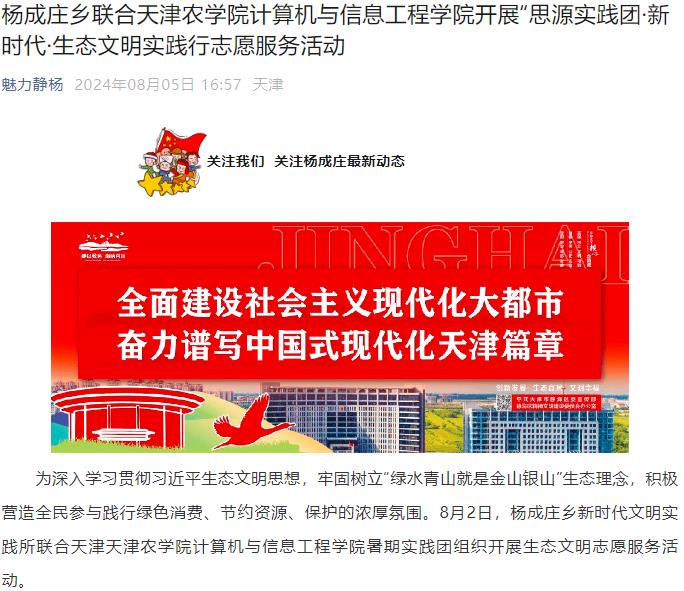 2024年8月5日,魅力静杨公众号报道杨成庄乡联合我校计算机与信息工程学院开展“思源实践团·新时代·生态文明实践行”志愿服务活动。
