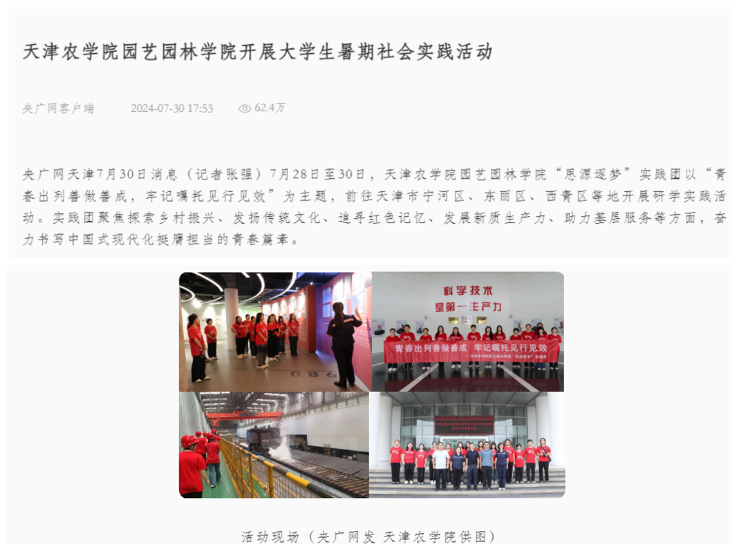 2024年7月30日,央广网客户端报道,园艺园林学院“思源逐梦”实践团前往天津市宁河区、东丽区、西青区等地开展研学实践活动。