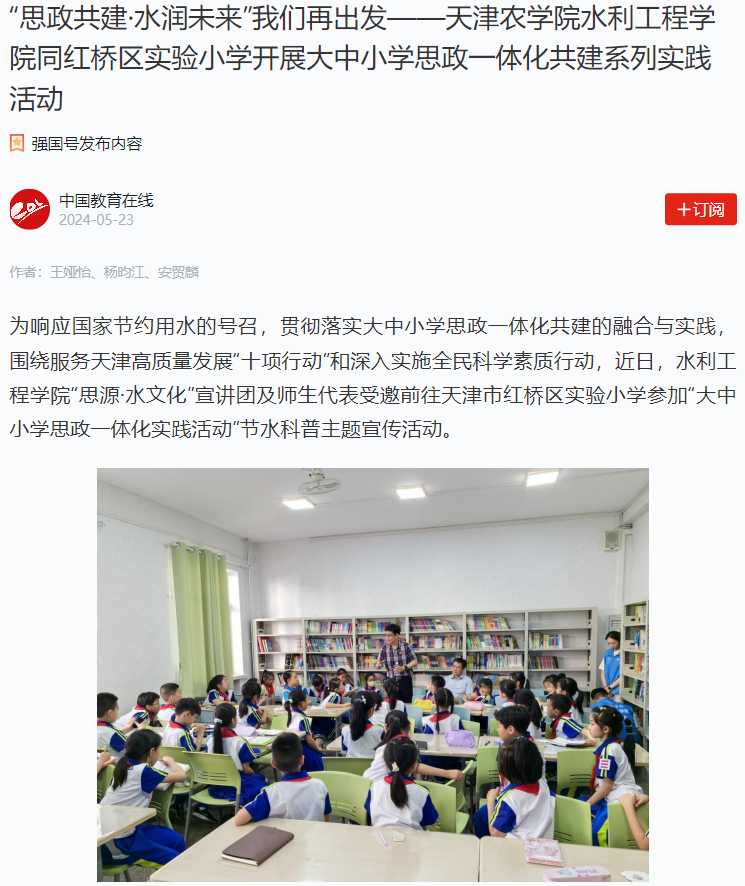 学习强国平台报道我校水利工程学院同红桥区实验小学开展大中小学思政一体化共建系列实践活动