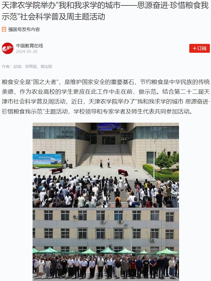 2024年5月26日,学习强国平台报道结合第二十二届天津市社会科学普及周活动,我校举办了“我和我求学的城市 思源奋进·珍惜粮食我示范”主题活动,学校领导和专家学者及师生代表共同参加活动。