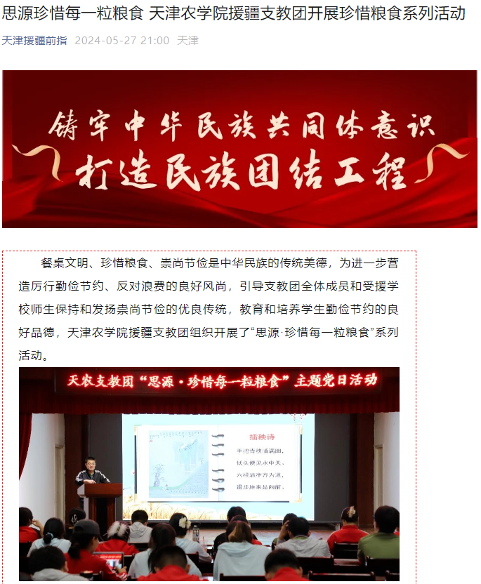 天津援疆前指公众号报道我校援疆支教团开展珍惜粮食系列活动