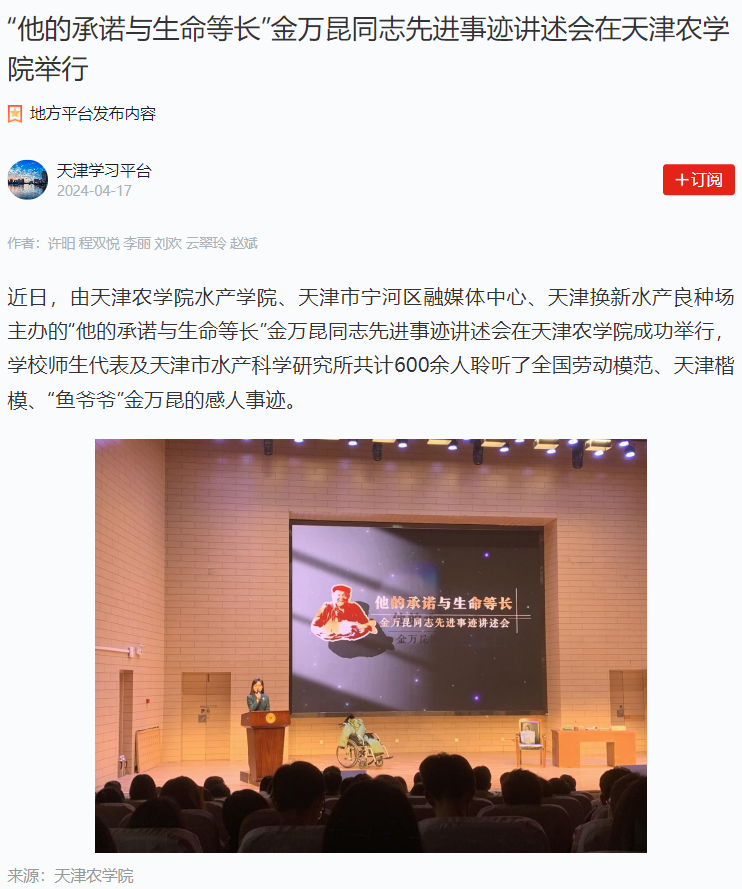 2024年4月17日,学习强国平台-天津学习平台报道我校水产学院、天津市宁河区融媒体中心、天津换新水产良种场主办的“他的承诺与生命等长”金万昆同志先进事迹讲述会在我校成功举行,学校师生代表及天津市水产科学研究所共计600余人聆听了全国劳动模范、天津楷模、“鱼爷爷”金万昆的感人事迹。
