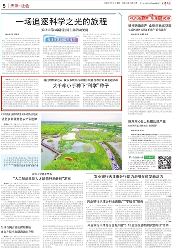 2024年5月20日,《天津日报》第05版以《大手牵小手种下“科学”种子》为题,报道在天津市第38届科技周到来之际,结合本次科技周主题“弘扬科学家精神 激发全社会创新活力”,我校开展科普教育主题活动,让学生在实践中感受科技魅力、种下“科学”种子。