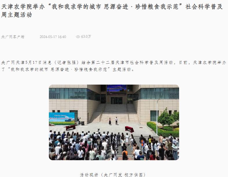 2024年5月17日,央广网客户端报道我校举办“我和我求学的城市 思源奋进·珍惜粮食我示范”社会科学普及周主题活动。