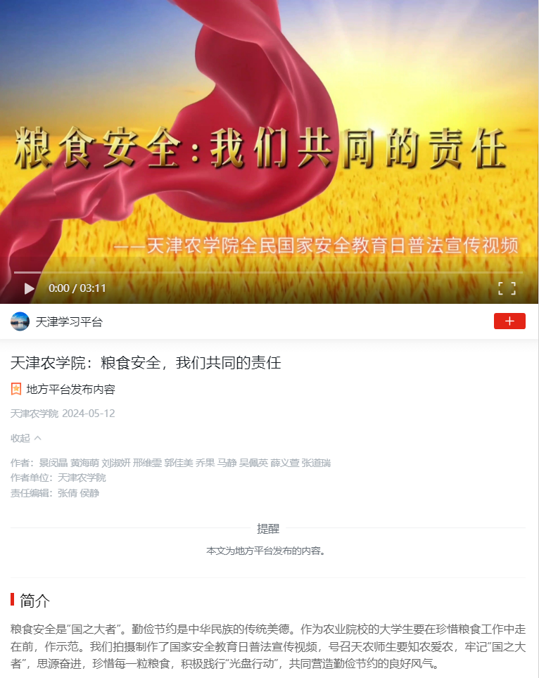 2024年5月12日,学习强国平台-天津学习平台展播我校拍摄制作的国家安全教育日普法宣传视频。